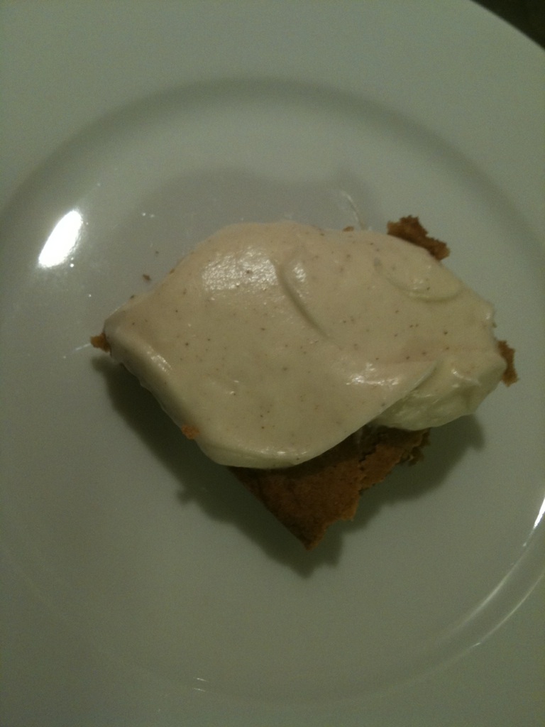 So, last night I got a bit bored and wanted to make something with pumpkin. After searching the internet for a bit, I found Salted Caramel Pumpkin Blondies. Yum. Unfortunately, I didn’t have any caramel and didn’t really want to make any, so I left that out of the recipe and created the most amazing frosting instead. I cannot even tell you how fabulous this frosting is, you’ll just need to try it yourself.